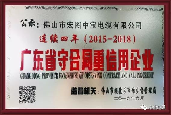 近日,廣東省工商行政管理局公布了2018年度廣東省“守合同重信用”企業(yè)名單,佛山市宏圖中寶電纜有限公司憑借企業(yè)自身完善的合同管理機構及管理制度,健全的合同信用管理體系,及良好合同履約狀況等企業(yè)誠信信用體系,連續(xù)四年榮獲廣東省守合同重信用”企業(yè)榮譽稱號。