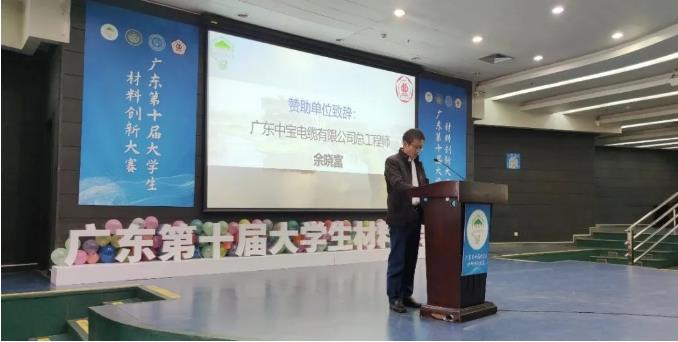 公司總工程師余總作為公司代表進(jìn)行講話,余總首先對(duì)本次材料創(chuàng)新大賽的成功舉辦和獲獎(jiǎng)的大學(xué)生表示了祝賀,鼓勵(lì)大學(xué)生未來可以研究出更多具有實(shí)際價(jià)值的創(chuàng)新性科學(xué)成果,并在科研的道路上不斷進(jìn)取、勇攀高峰。同時(shí)也感謝廣東工業(yè)大學(xué)對(duì)中寶電纜的信任,邀請(qǐng)我們作為本屆大賽的贊助商,共同合作舉辦此次大賽,共同促進(jìn)教育科研事業(yè)健康發(fā)展公司熱心公益、關(guān)注社會(huì)、關(guān)愛大學(xué)生,支持大賽舉辦是公司回饋社會(huì)的體現(xiàn)。